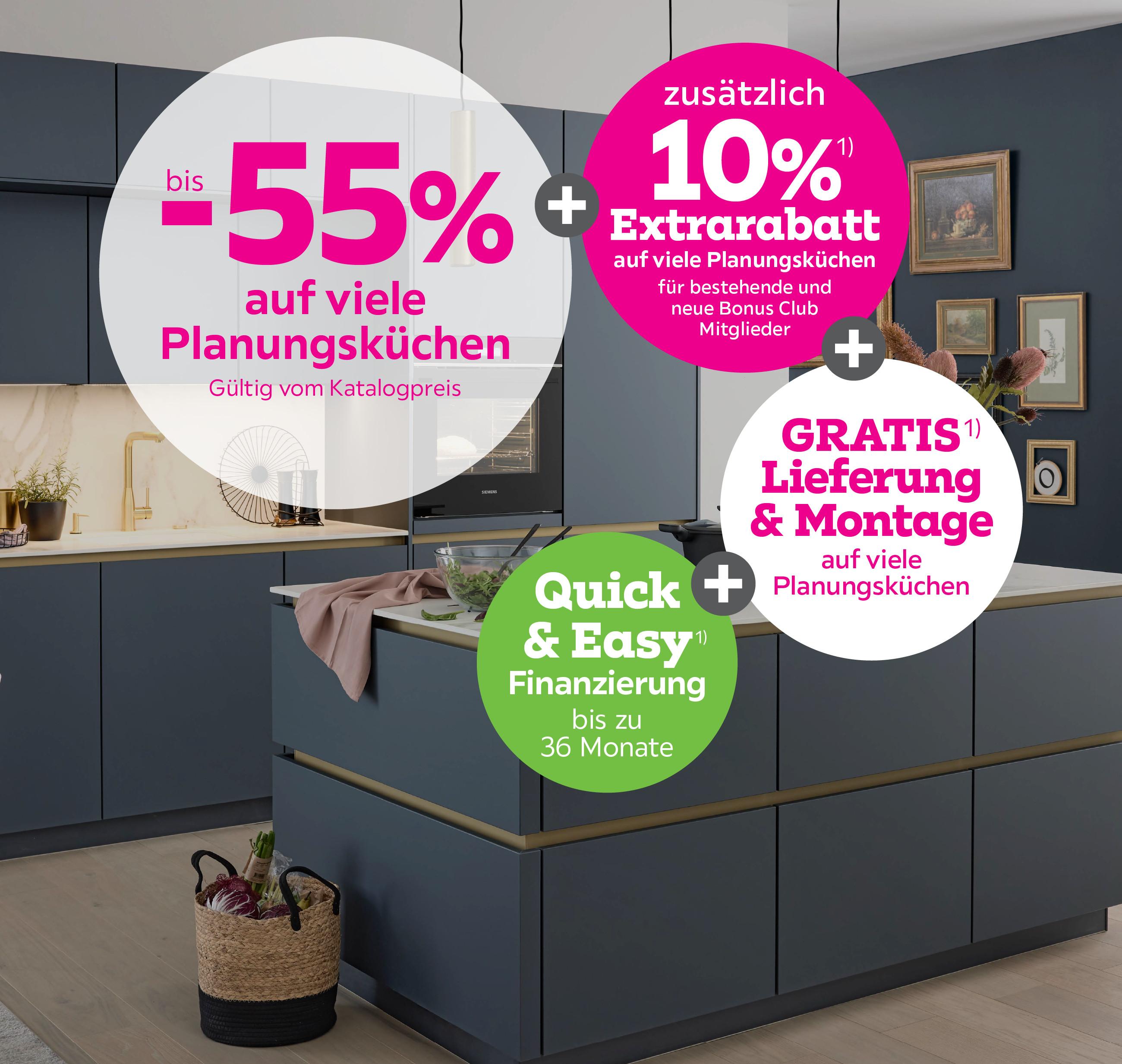 Vermessen, planen, liefern, montieren! Nicht nur deine Traumküche wirst du in der bunten mömax Küchenabteilung finden – unsere Küchenexperten kümmern sich auch um die wirklich zeitaufwendigen Dinge wie die Vermessung deines Raums, die detaillierte Planung, eine pünktliche Lieferung und die perfekte Montage deiner Küchenmöbel sowie Geräte. So kannst du dich auf das Wesentliche konzentrieren: auf Ausstattung und Stil deiner neuen Küche! Günstige Küchen kaufst du bei mömax auf Wunsch und je nach Modell mit allen Extras, inklusive Top-Küchengeräte, wie du es vom professionellen Küchenhandel erwarten darfst! Im Onlineshop oder im nächstgelegenen mömax Einrichtungshaus kannst du dich schon vorab von den verschiedenen Möglichkeiten inspirieren lassen und dich über aktuelle Aktionen informieren.