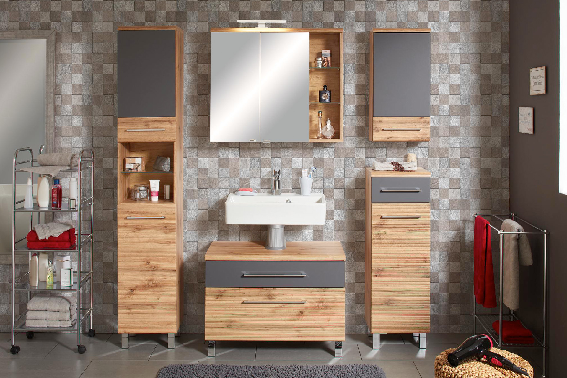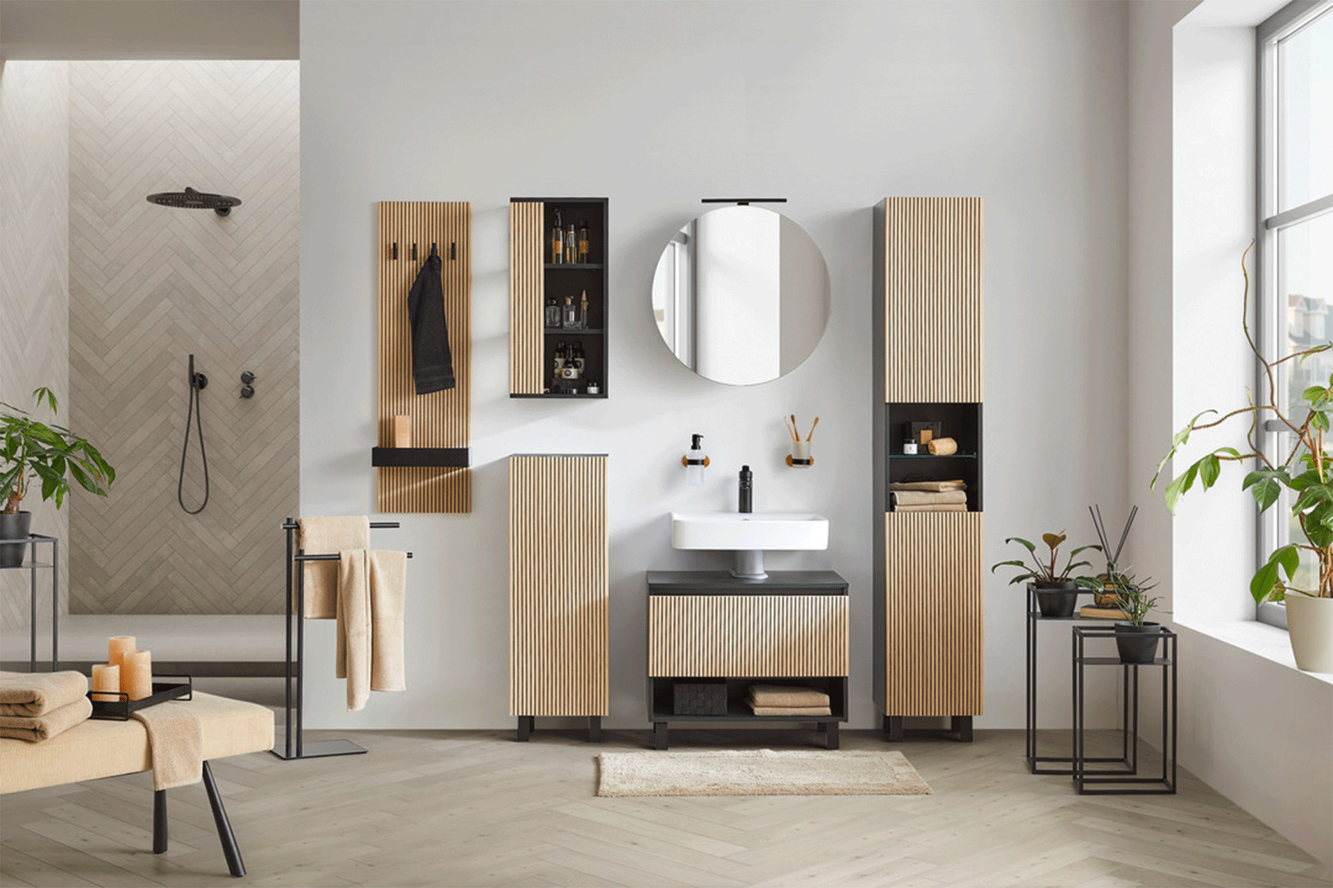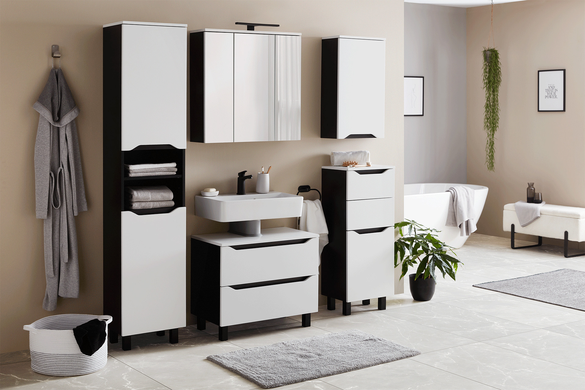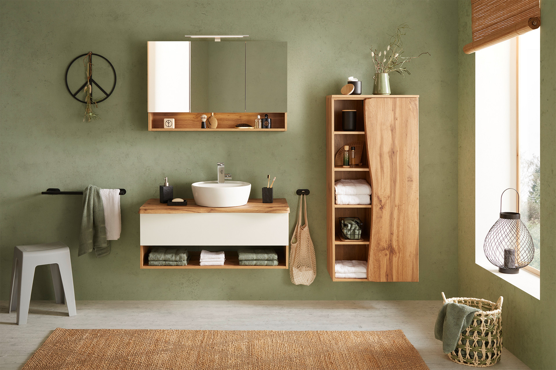 Endlich genug Platz im Bad! Der oftmals wenige Quadratmeter großer Raum bietet selten genug Stauraum. Die Grundfläche Ihres Badezimmers können wir leider nicht ändern, wohl aber die Größe Ihres Stauraums! Je nach Badserie, werden mehr oder weniger viele Schränk geboten. Mit Hochschrank, Unterschrank, Hängeschrank und Spiegelschrank sollte aber genug Platz für alle Ihre Badutensilien sein. Dank der mömax Badezimmerserien wird Ihr Bad nicht nur zum Wellness-Tempel, sondern auch zum Stauraum-Wunder. Jetzt die richtige Badezimmer Ausstattung finden!