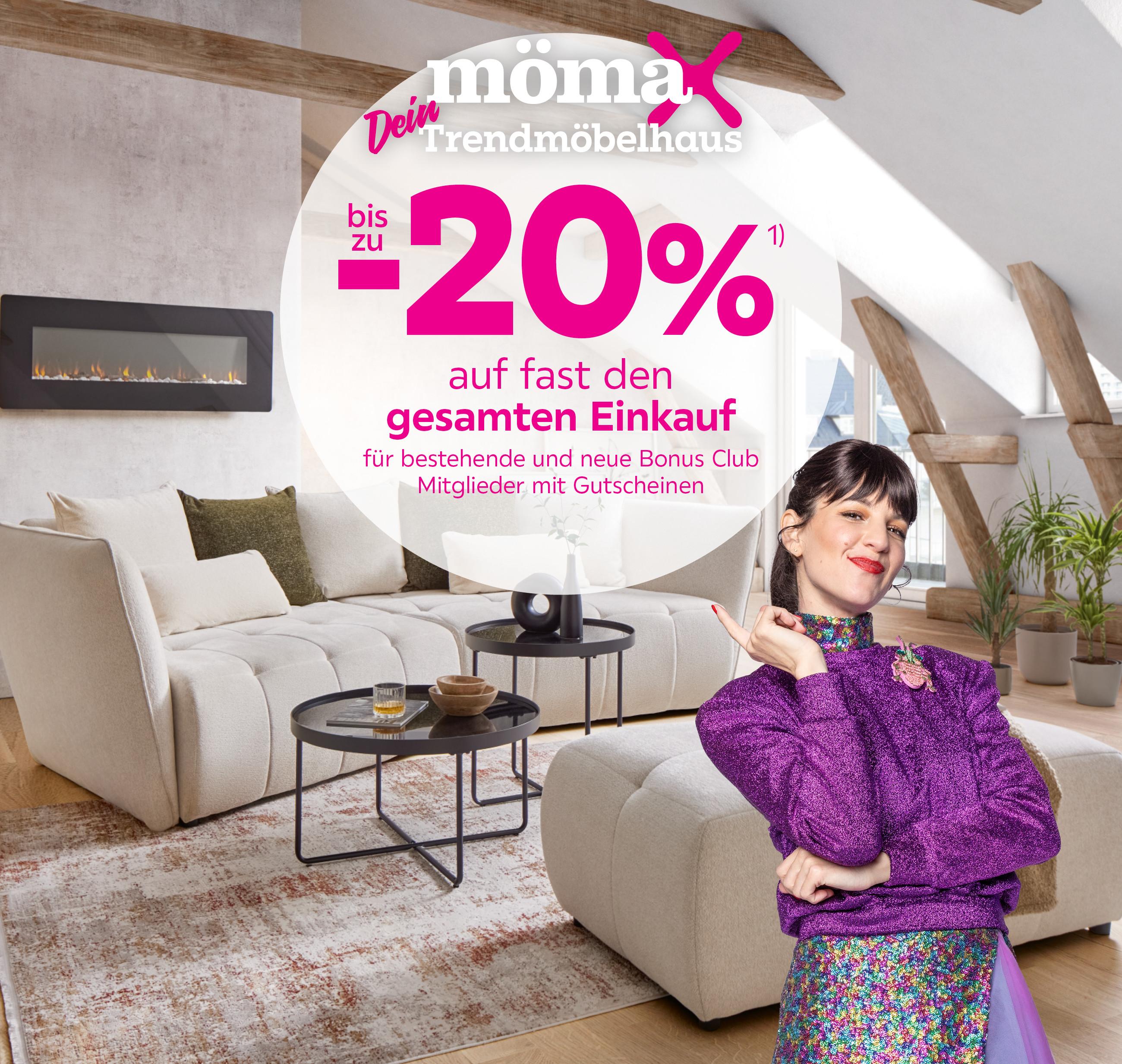 1) Gültig bis 11.10.2025. Gültig ab dem vorgegebenen Einkaufswert. Ausgenommen reduzierte sowie in unseren Prospekten oder Werbemitteln beworbene Ware, die im Haus gekennzeichnet ist. Bei Inanspruchnahme keine weiteren Konditionen möglich. Nicht gültig auf bereits Aufträge, und Kauf von Produkten der Marken based, Bestpreis, Respekta, Livetastic, Mid.You, P&B, Bora, Miele, ECO Tree, Weide, X Rocker, Yatas, KARE, MAX WINZER, Acamp, Gardenson, Träumeland, Gutscheine, Nahrungsmittel und Mäser. Pro Einkauf und Kunde nur ein Gutschein gültig. Alle Abschläge beziehen sich auf den Abholpreis. Keine Barauszahlung möglich. Auch im Onlineshop einlösbar.