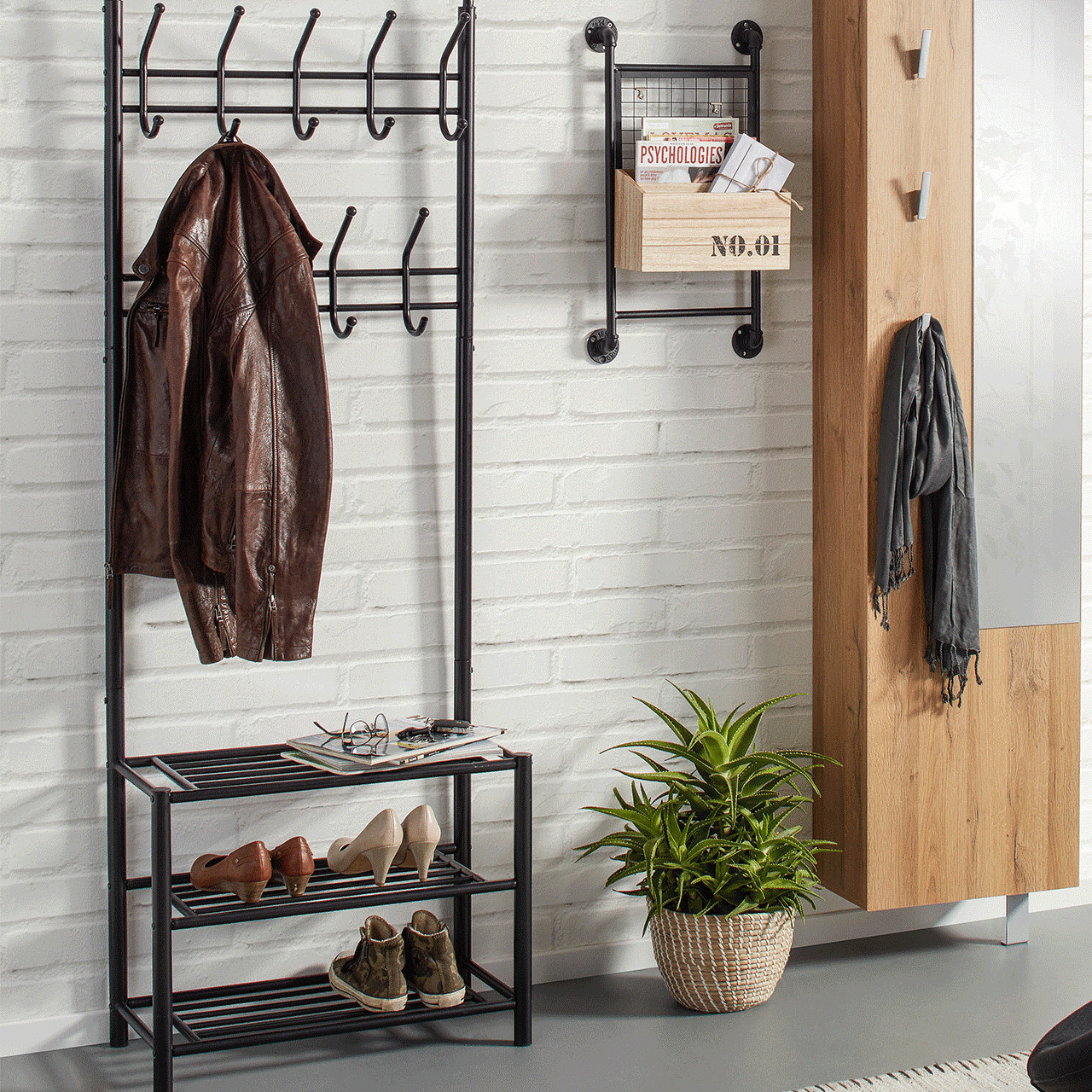 - Voll im Trend liegen Sie mit dem Industrial Look: Garderoben in Eiche-Optik mit schwarzen Eisenelementen sorgen für einen Hauch Fabrik-Charme.