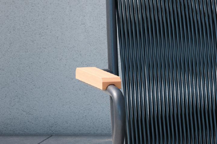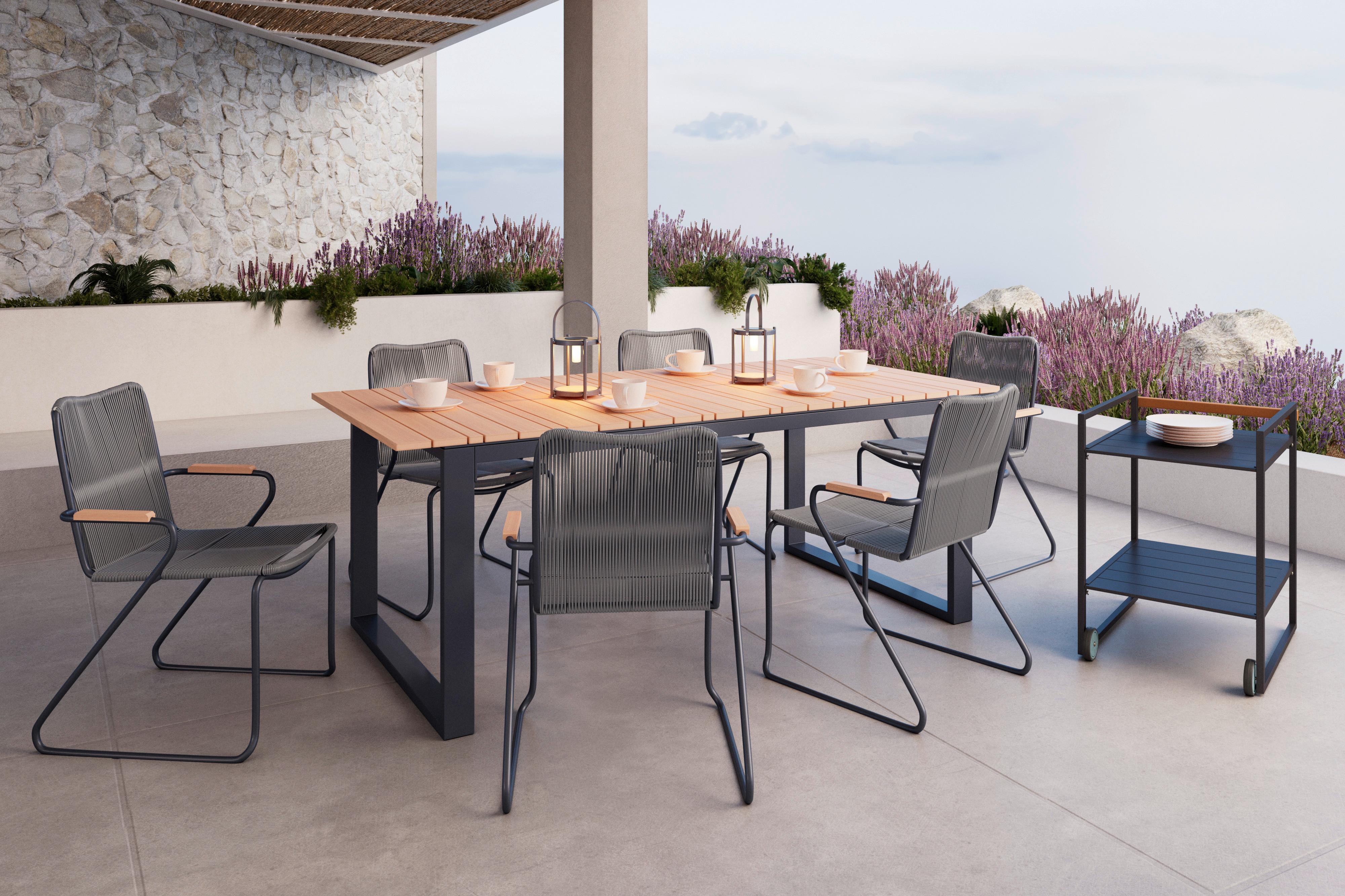 Die geschwungenen Formen sorgen für eine zeitgemäße Optik, während die teakfarbenen Armlehnen aus Polywood dem Set eine warme und natürliche Note verleihen. Polywood ist ein innovatives Material, das die Optik von echtem Holz nachahmt, dabei aber wesentlich pflegeleichter und robuster ist. Es ist witterungsbeständig, splittert nicht und benötigt keinerlei aufwendige Pflege oder Nachbehandlung wie herkömmliches Holz.