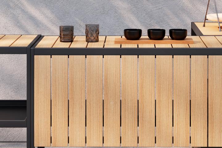 Entdecken Sie die perfekte Kombination aus Design, Funktionalität und Langlebigkeit mit unserer modernen Outdoorküche in eleganten Naturfarben und stilvollem Schwarz. Gefertigt aus robustem Metall und hochwertigem Polywood vereint sie natürliche Ästhetik mit pflegeleichter Beständigkeit – ideal für den ganzjährigen Einsatz im Freien. Polywood ist ein innovatives Material, das die warme Holzoptik mit den Vorteilen eines wetterfesten Kunststoffs verbindet.
