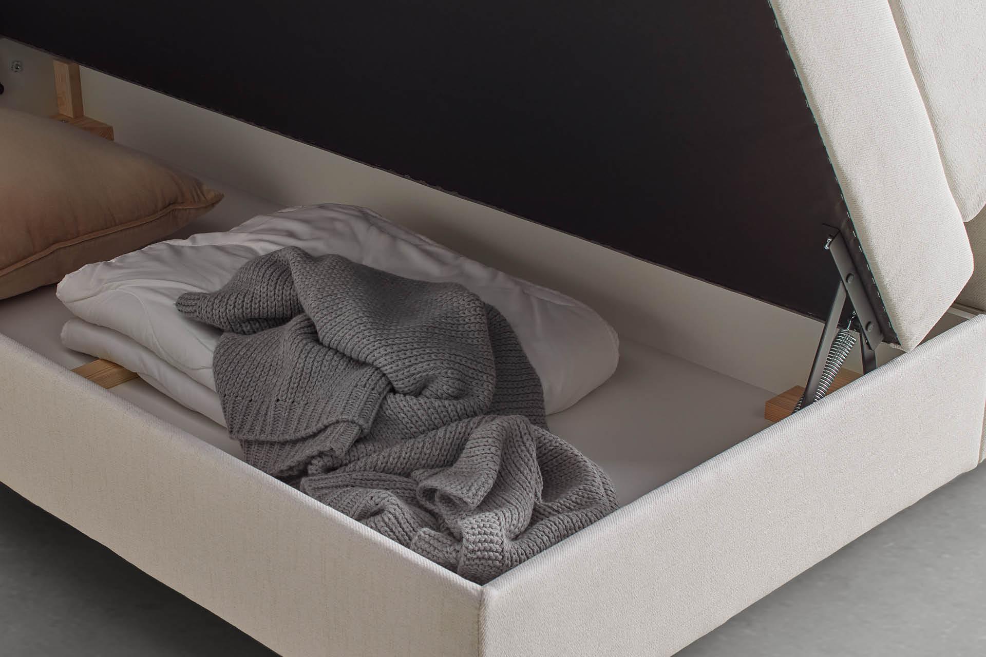 Besonders funktional zeigt sich das Bett durch den großzügigen, integrierten Bettkasten. Er bietet viel Platz für Bettwäsche, Kissen, saisonale Kleidung oder andere Textilien – ordentlich verstaut und geschützt vor Staub. Der leichtgängige Hebemechanismus ermöglicht einen einfachen Zugriff, ohne großen Kraftaufwand. Ideal für kleine Räume oder alle, die zusätzlichen Stauraum schätzen, ohne auf Stil zu verzichten.