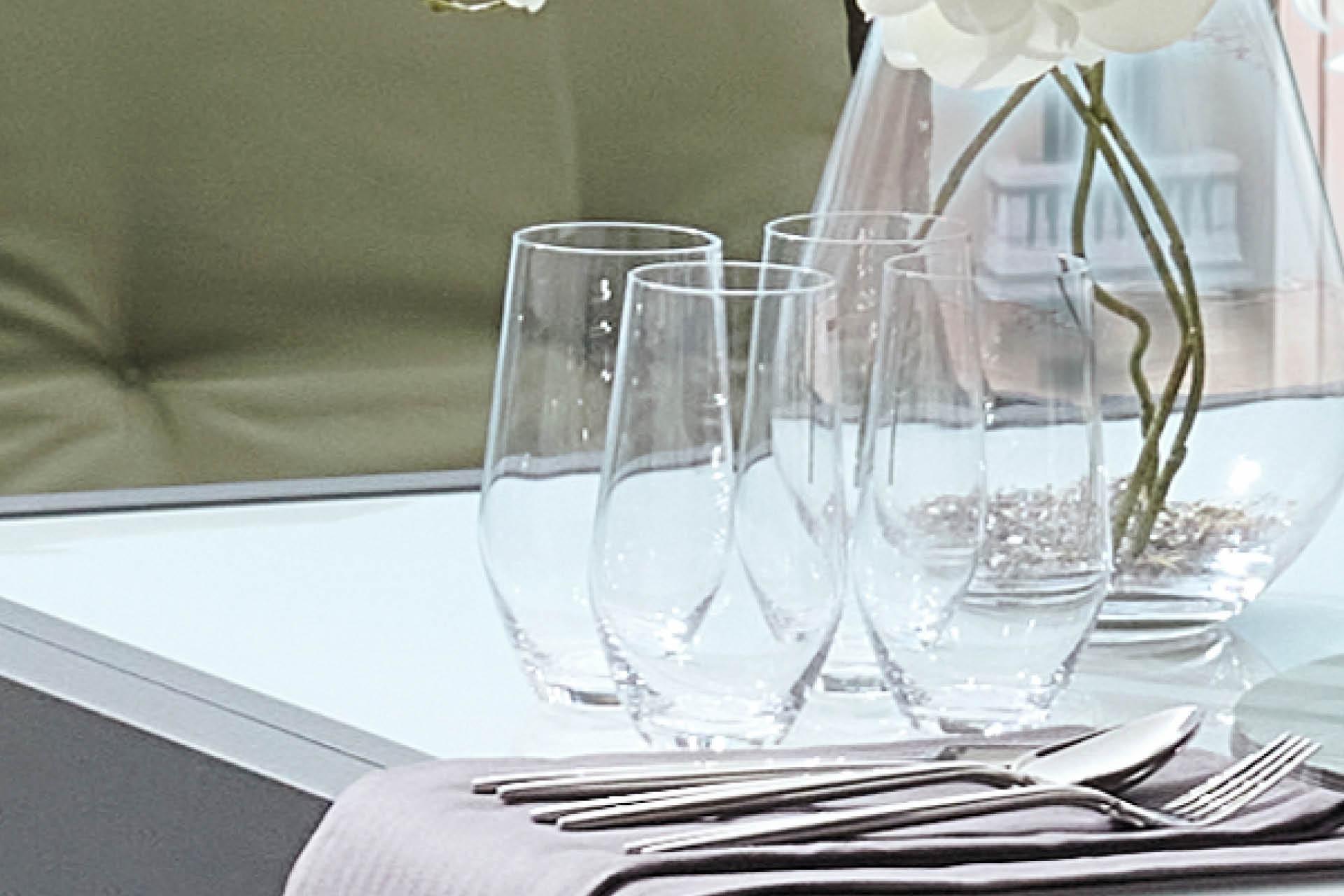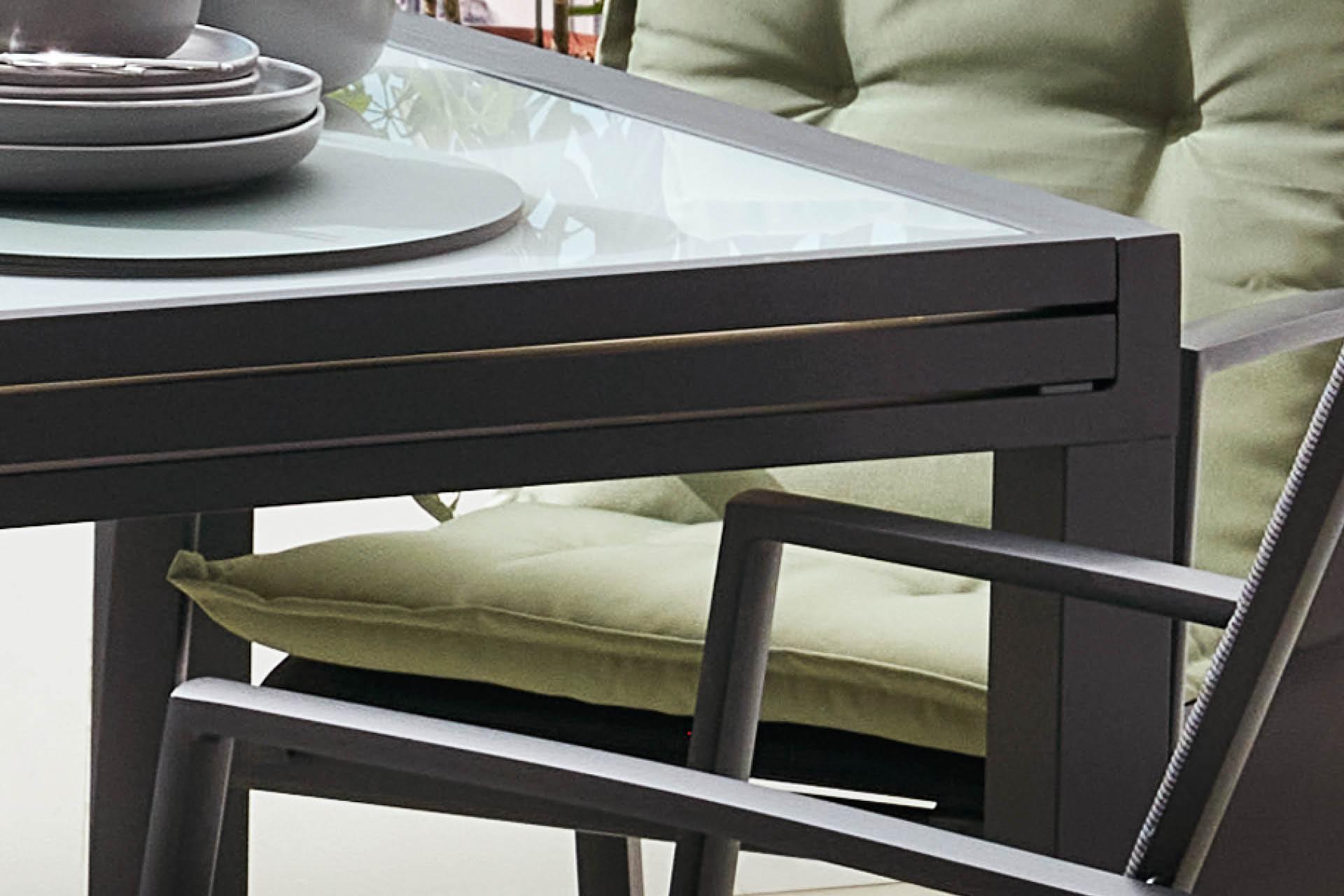 Die matte Glasplatte aus hochwertigem Milchglas verleiht dem Tisch eine edle, zurückhaltende Optik und ist dabei besonders alltagstauglich. Fingerabdrücke und leichte Verschmutzungen sind kaum sichtbar, was sie ideal für den regelmäßigen Gebrauch im Freien macht. Zudem reduziert das Milchglas störende Lichtreflexe, indem es Sonnenstrahlen sanft streut – perfekt für sonnige Tage auf Balkon, Terrasse oder im Garten.