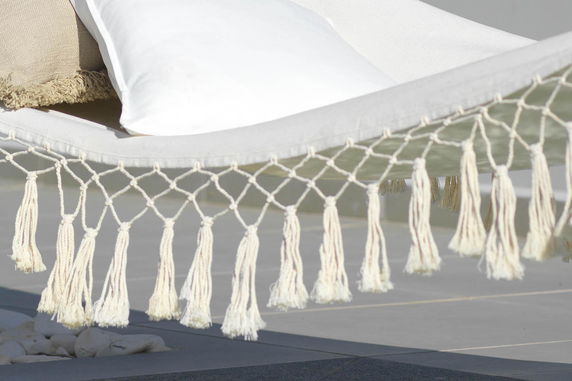 Die robuste Konstruktion sorgt für sicheren Halt und angenehmes Schwingen – ideal, um nach einem langen Tag zur Ruhe zu kommen. Die Hängematte lässt sich einfach zwischen zwei Bäumen befestigen – perfekt für alle, die die Flexibilität lieben und ihren Lieblingsplatz in der Natur frei wählen möchten. Dank ihrer zeitlosen Farbgebung und der natürlichen Materialien ist diese Hängematte nicht nur ein Ort der Entspannung, sondern auch ein echter Hingucker in jedem Außenbereich.