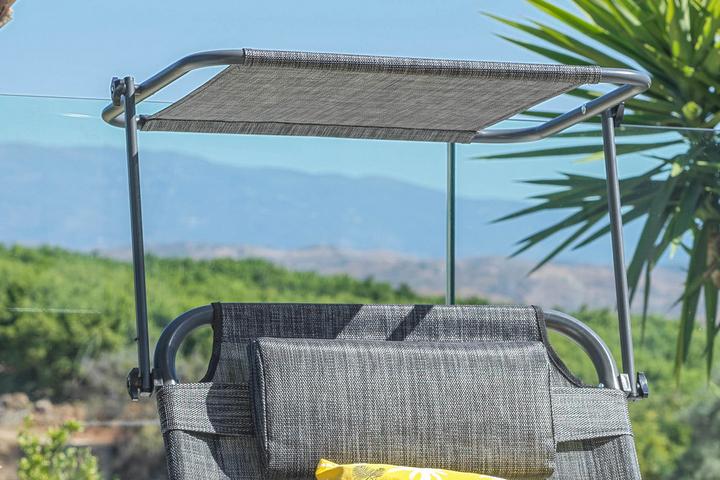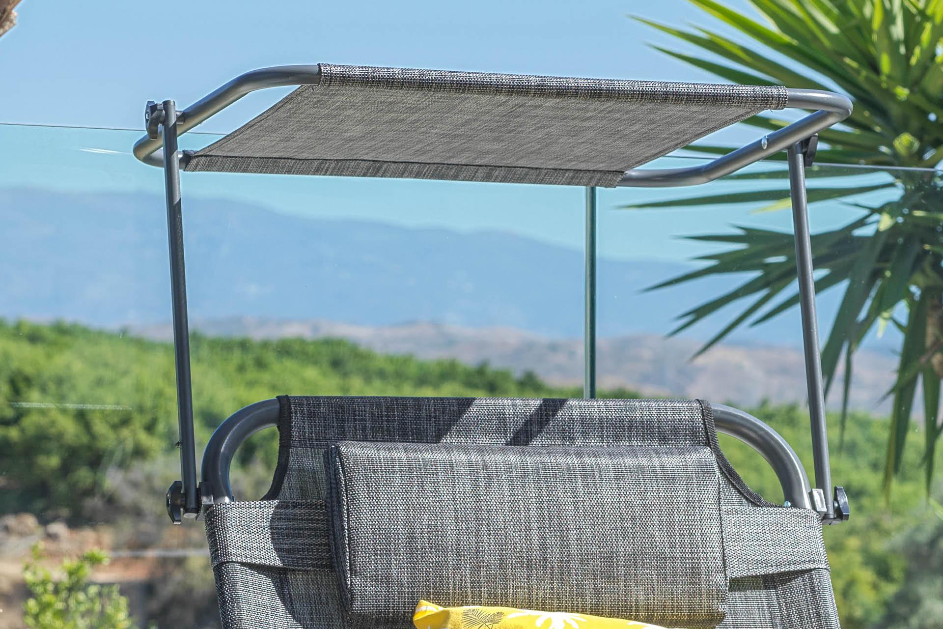 Die verstellbare Rückenlehne ermöglicht es, die Liegeposition ganz nach Wunsch anzupassen – ob aufrecht zum Lesen, halb liegend zum Entspannen oder komplett zurückgelehnt für ein erholsames Sonnenbad. Ein weiteres Highlight ist das praktische, ebenfalls verstellbare Sonnendach, das sich flexibel einstellen lässt und zuverlässigen Schatten spendet – ideal, um das Gesicht vor direkter Sonneneinstrahlung zu schützen, ohne auf die Sonne am Körper verzichten zu müssen.