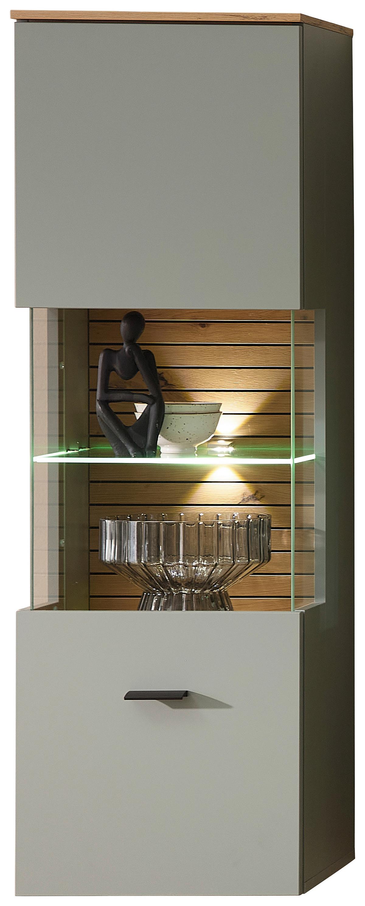 Die Hängevitrine Memphis vereint modernes Design mit praktischer Funktionalität. Mit den kompakten Maßen ca. 40 × 124 × 36 cm (B x H x T) bietet sie ausreichend Stauraum hinter zwei Türen mit Soft-Close-System. Gefertigt aus hochwertigem Holzwerkstoff (MDF/Flachpressplatte) mit Dekorfolie überzeugt die Vitrine durch robuste Qualität und pflegeleichte Oberfläche. Die Kombination aus Grün und Eiche Artisan sorgt für einen natürlichen, modernen Look in jedem Wohnbereich.