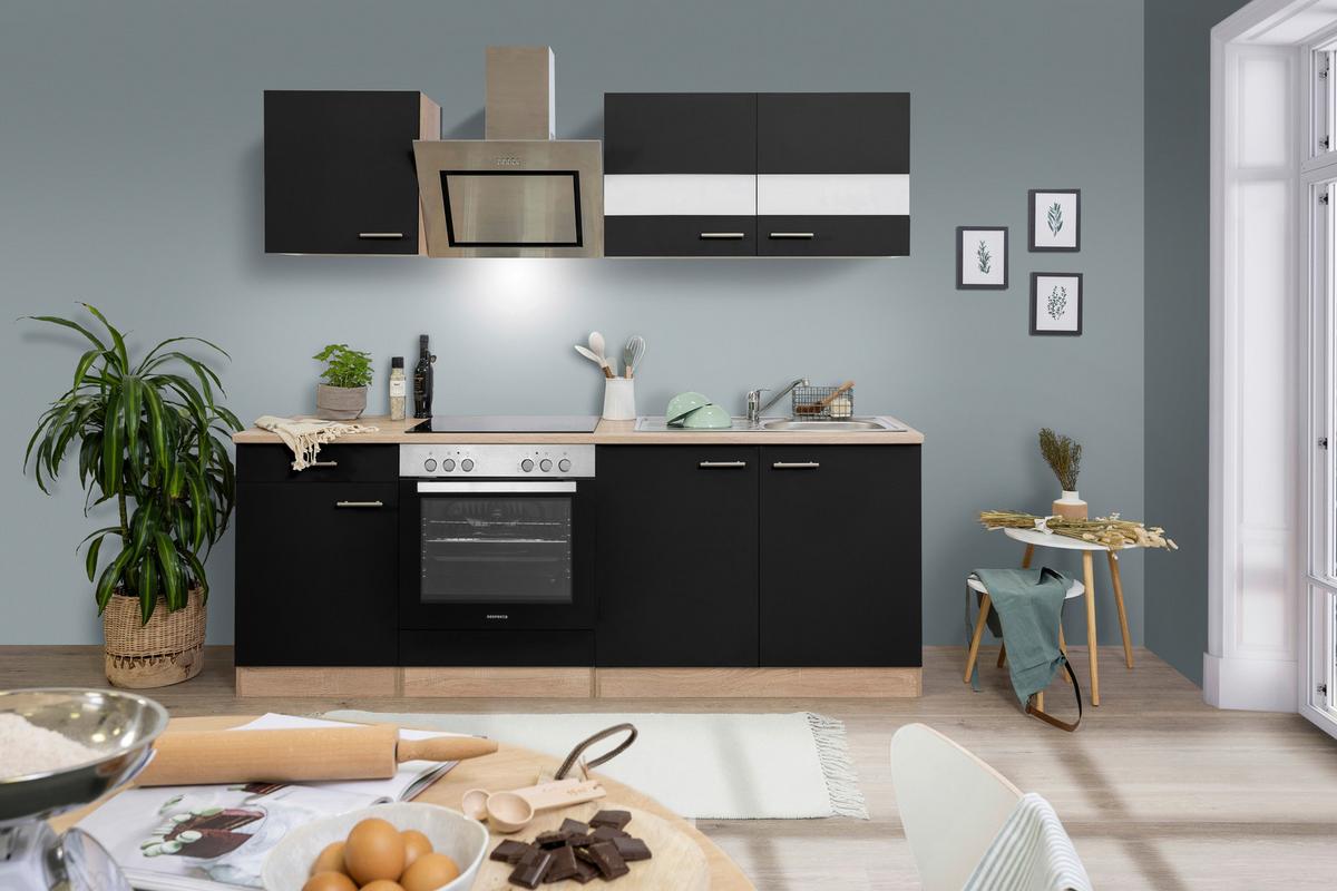 Küchenblock Merle mit Geräten ca. 210 cm Schwarz - Edelstahlfarben/Eichefarben, Basics, Holzwerkstoff/Metall (210cm) - Respekta