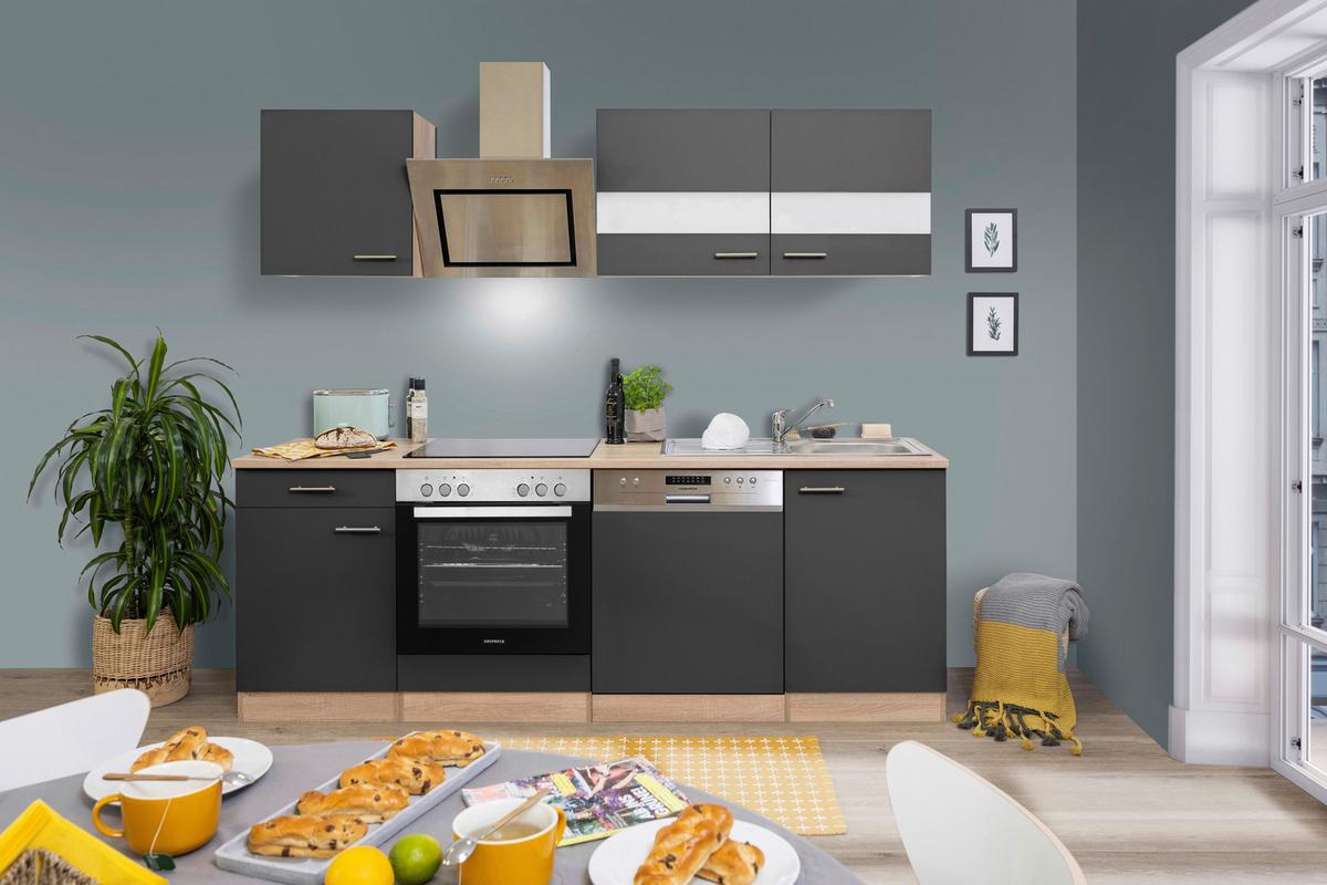Küchenblock Merle mit Geräten ca. 220 cm Grau - Edelstahlfarben/Eichefarben, Basics, Holzwerkstoff/Metall (220cm) - Respekta
