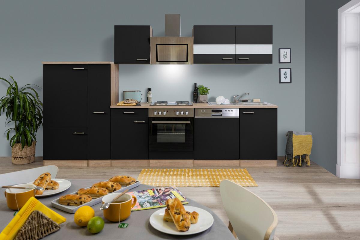 Küchenblock Merle mit Geräten ca. 310 cm Schwarz - Edelstahlfarben/Eichefarben, Basics, Holzwerkstoff/Metall (310cm) - Respekta