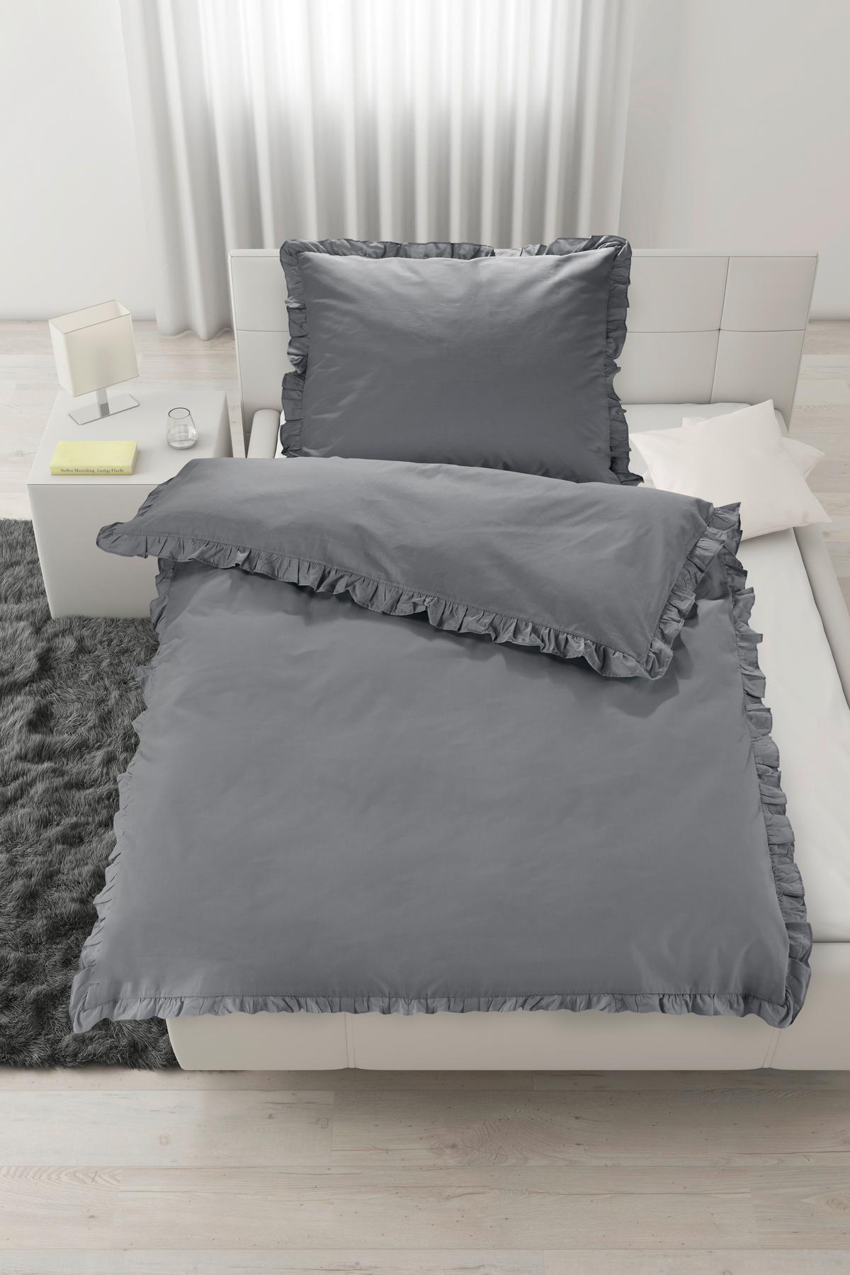 Mit dieser eleganten Bettwäsche in Grau bringen Sie ein romantisches Ambiente in Ihr Schlafzimmer. Stilechte Rüschen machen die Bettwäsche zum sicheren Blickfang.